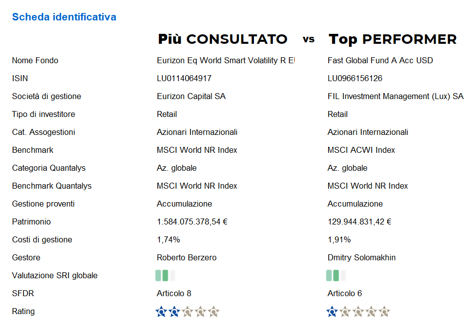 Scopri le schede Quantalys del fondo “Più Consultato” e del fondo “Top Performer”, appartenente alla stessa categoria Quantalys di settembre 2025.