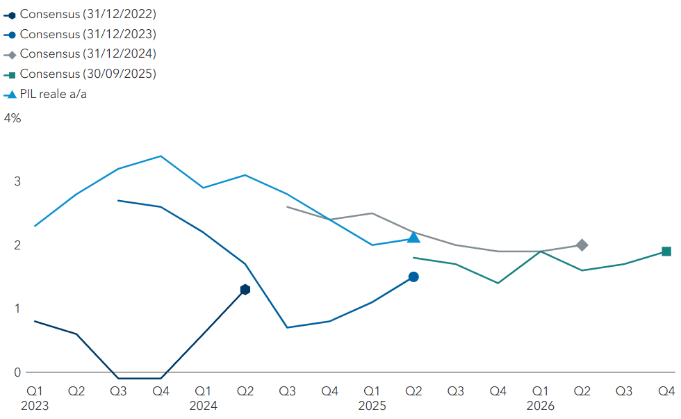 Fonti: Capital Group, Bloomberg. Il consensus riflette le stime di crescita del PIL reale statunitense su base annua lato vendita. Il PIL (prodotto interno lordo) reale è il valore corretto per l'inflazione dei beni e dei servizi prodotti dal lavoro e dalle proprietà situate negli Stati Uniti.