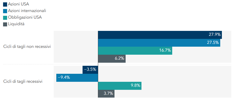I mercati hanno premiato gli investitori quando i tagli dei tassi sono avvenuti al di fuori di una recessione. In media, l'indice S&P 500 ha registrato un rendimento del 27,9%, mentre il Bloomberg US Aggregate del 16,7%.