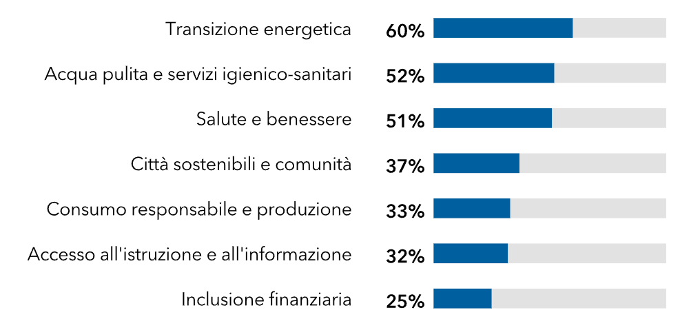 Sei intervistati su 10 credono fermamente nelle opportunità di investimento correlate alla transizione energetica. Oltre la metà degli intervistati ritiene che l'acqua pulita, i servizi igienico-sanitari, la salute e il benessere siano temi a elevata convinzione.